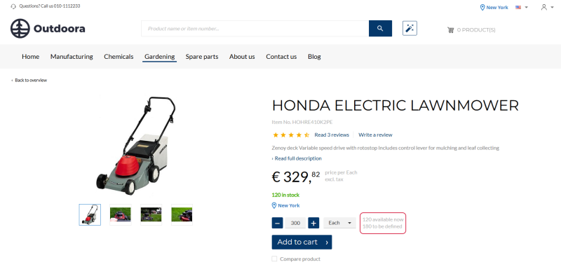 B2B layout: Real-time stock availability is shown dynamically when customers enter a specific product quantity, select a location, or a unit of measure.