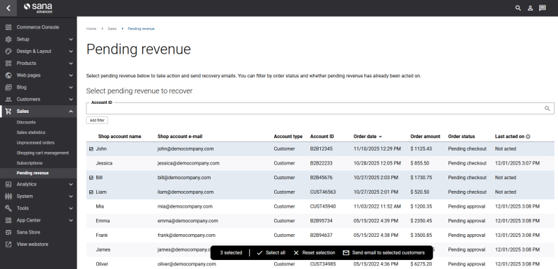 E-commerce managers can select individual customers or multiple customers at once with pending checkout or approval orders and send reminder e-mails directly from the Pending revenue page.