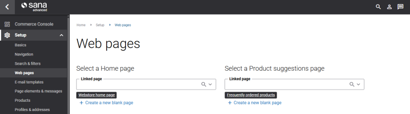 In the area Select a Product suggestions page, search for the page which you created in the previous step and select it. Clicking on the product suggestions button in the webstore opens this page. Product suggestions are retrieved from the ERP system, based on the customer's order history within a certain period set in ERP, and are shown to the customer.