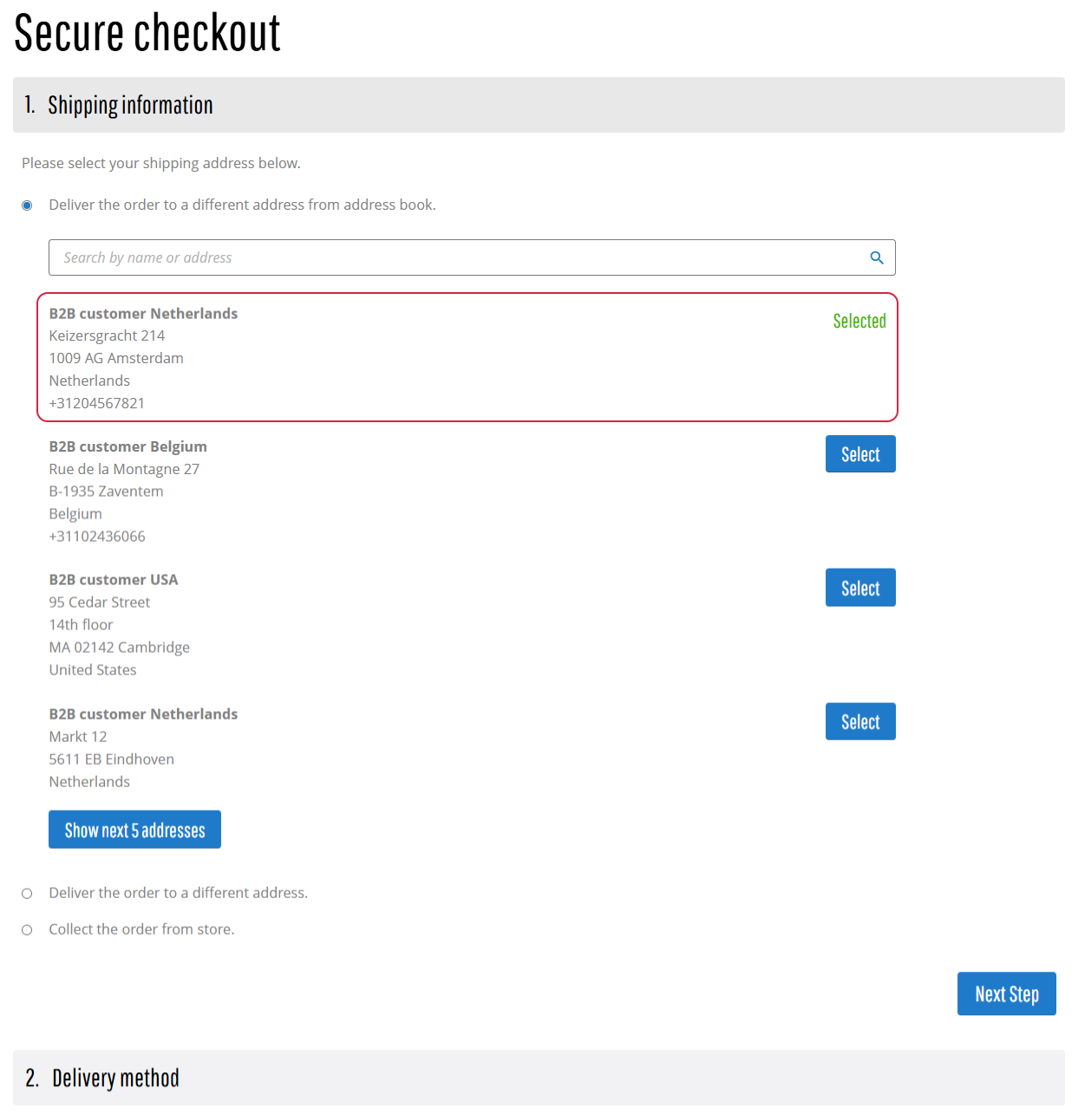 Sales agreements can include predefined shipping addresses. When a sales agreement is applied to a sales order and its shipping address matches the customer’s shipping address, that address will be preselected on the Shipping information step at checkout, but the customer can change it.