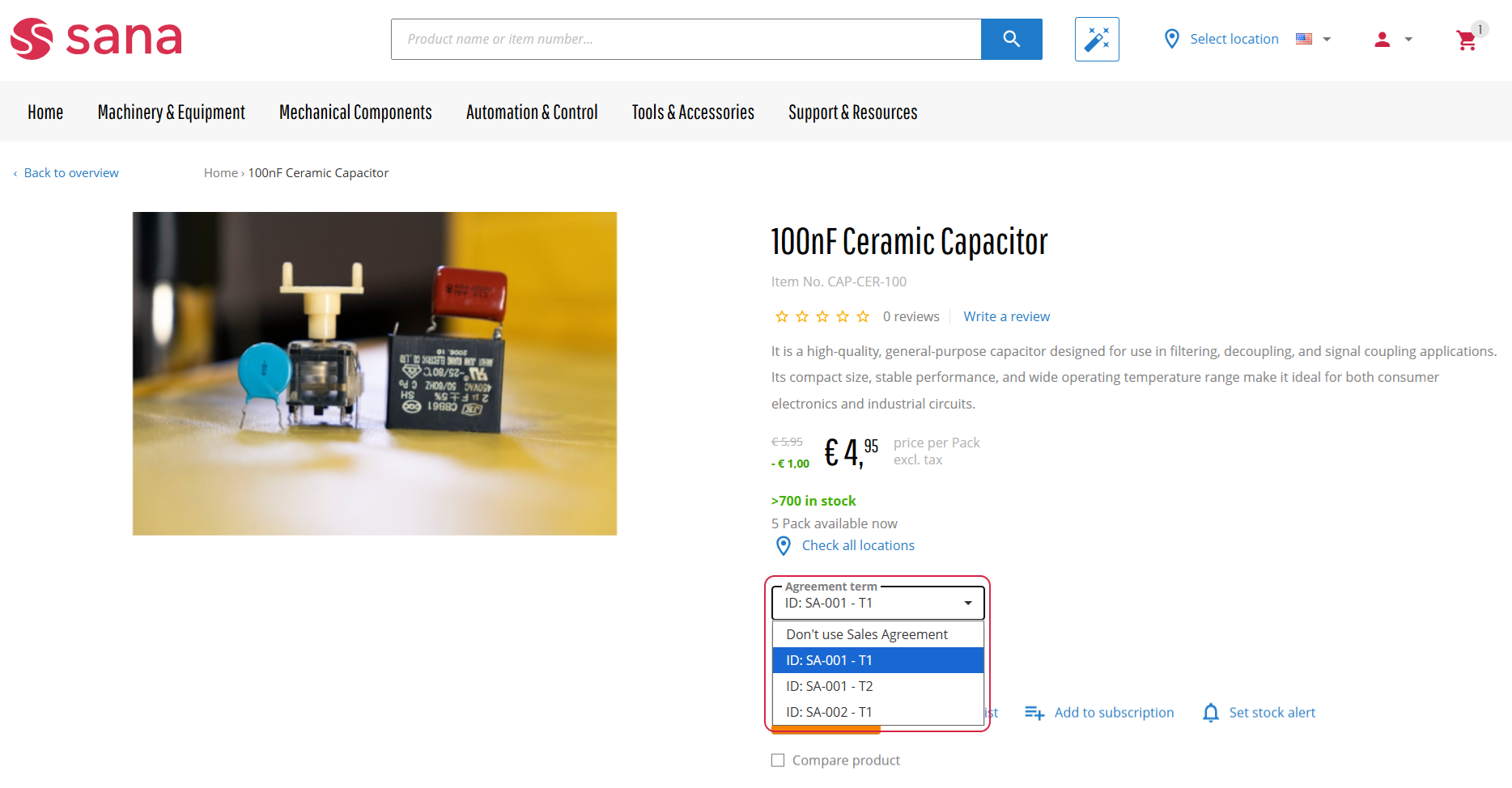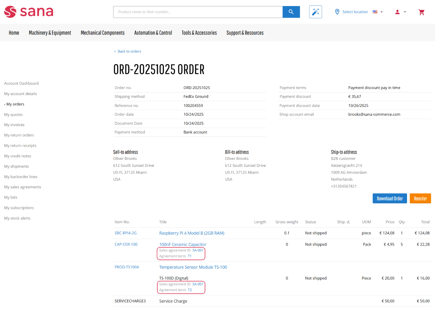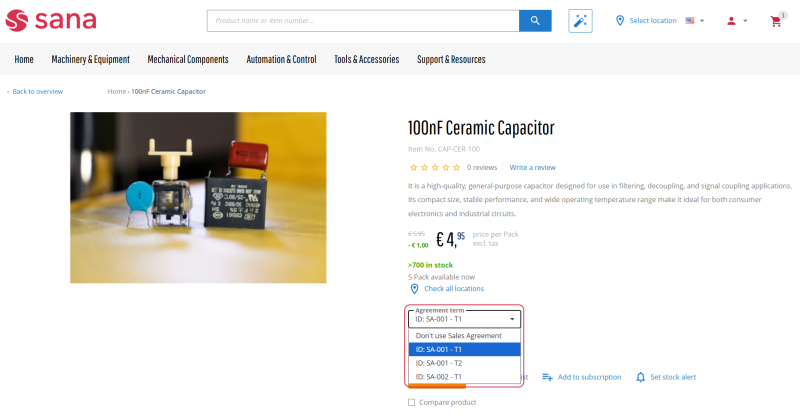 Business customers can see all available sales agreements and their details in the Sana webstore. Customers can place orders based on the sales agreements that they have with the merchants triggering all the terms and conditions in the ERP system. A customer can also combine the products from the sales agreements with those that do not relate to any agreement in one sales order.