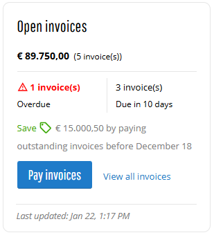 It allows customers to quickly review their outstanding invoices from the ERP system directly in the Sana webstore. It consolidates all unpaid invoices into a single, easy-to-read overview, helping customers stay informed and plan payments more effectively. This improves transparency and reduces the need for manual communication with the sales or finance team.