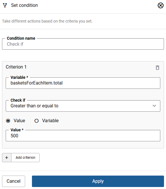 | Criterion | One or more rules to evaluate. For each criterion, select a variable and the field to check, then define the comparison. Multiple criteria are combined using AND (all must be true) or OR (any one must be true). |