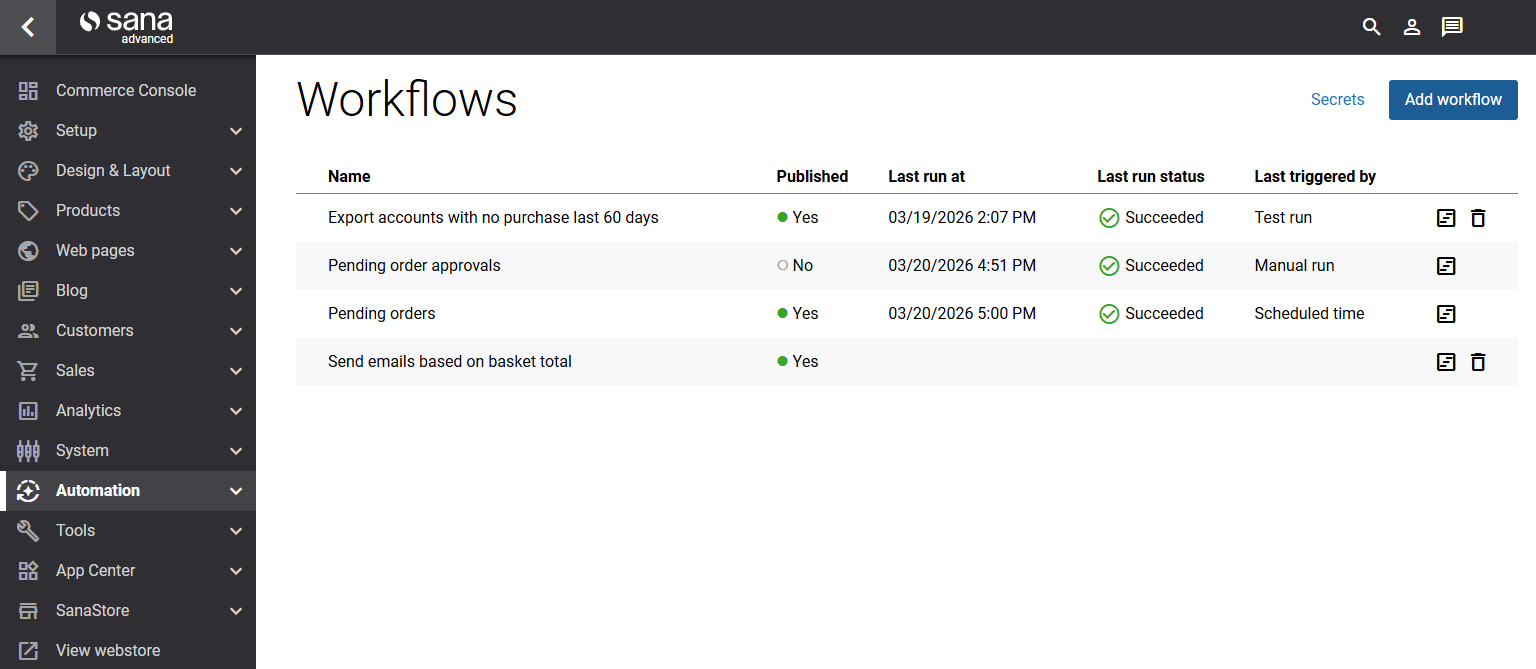 Once published, the workflow will run automatically according to its trigger schedule. The Published column in the workflow list displays Yes.