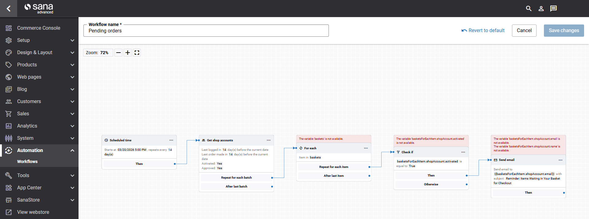 A workflow cannot be saved if it contains validation errors. The workflow editor highlights invalid elements in red and displays a message describing the issue. Common causes include: