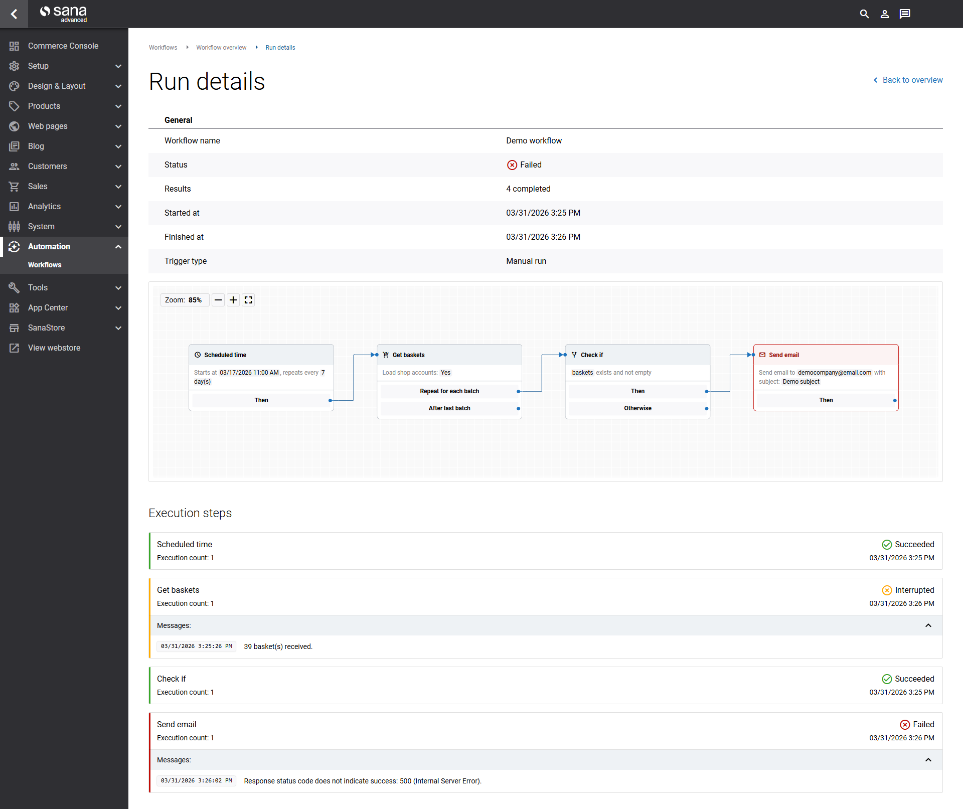 If a workflow run fails, click Details in the Recent runs list to open the Run details page. In the Execution steps section, locate the step highlighted in red to see the failure reason. All workflow steps after the failed step are shown as disabled.