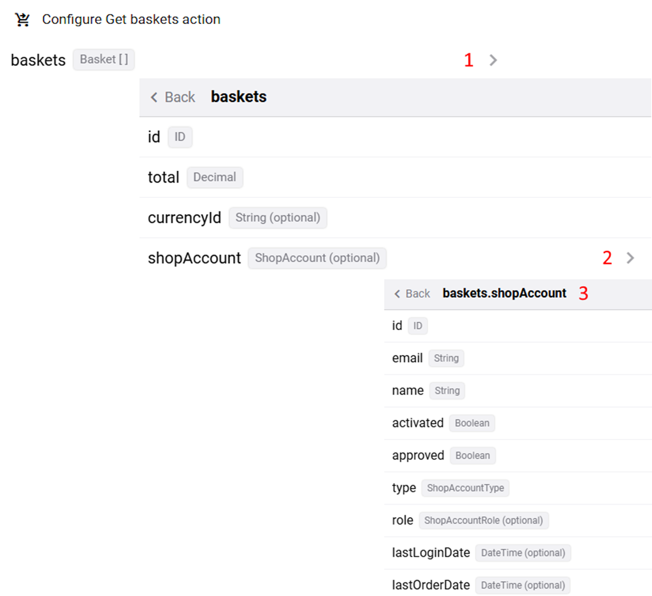 After adding the Get baskets action that returned a list (array) of basket objects, the following variable structure becomes available to subsequent steps, for example, the Check if condition: