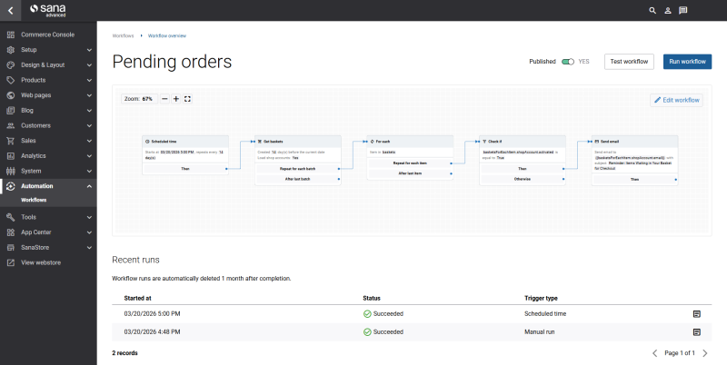 Workflows are built around an intuitive, canvas-based workflow builder designed for business users. Through a visual, flowchart-style interface, you can configure scheduled triggers, retrieve webstore data, define conditions, and connect actions - all without complex development work. Workflows can be tested, adjusted, and published directly from Sana Admin, making it straightforward to scale automation across your organization.