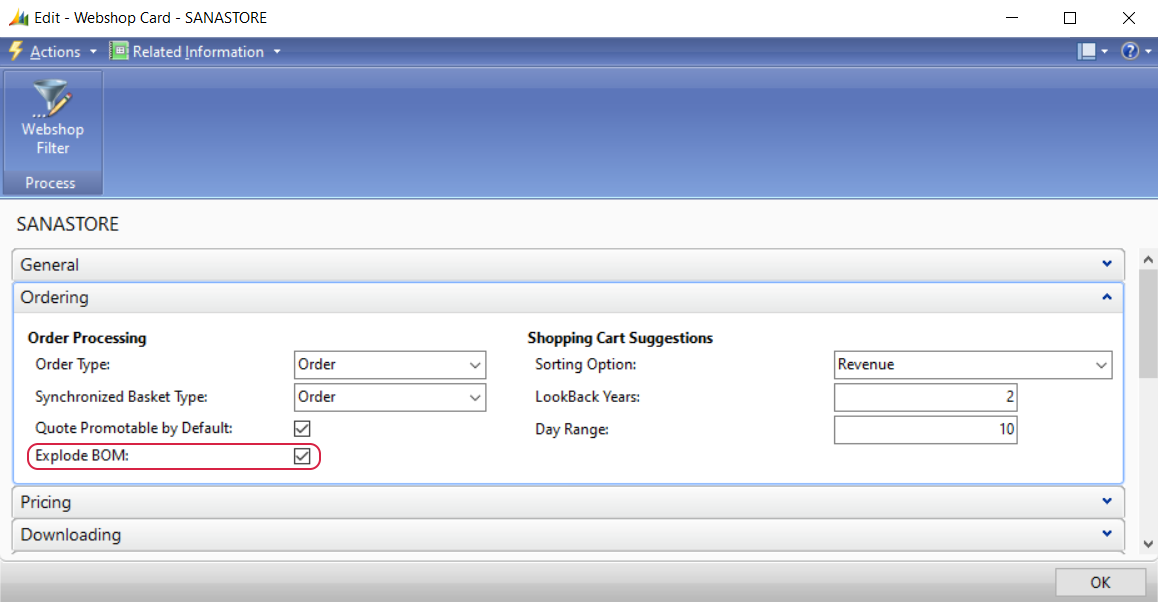 To allow bill of materials explosion, in Microsoft Dynamics NAV click: Webshop > Lists > Webshops. Select the necessary webshop and on the Ordering FastTab, enable the Explode BOM option.
