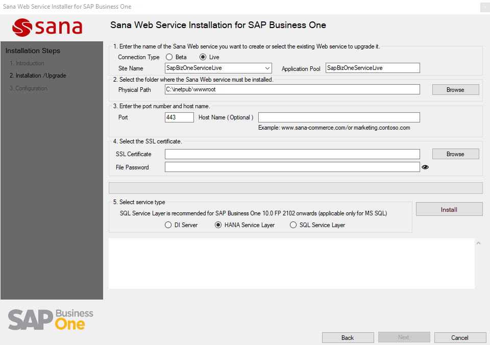 The Sana Web Service Installer will create the web site and application pool for the Sana Web Service in the IIS Manager, extract the ERP Web Service files to the installation folder, and set up the Web Service authentication. If you have added the SSL certificate, it will also set up the Sana Web Service for SAP Business One Cloud to use SSL.
