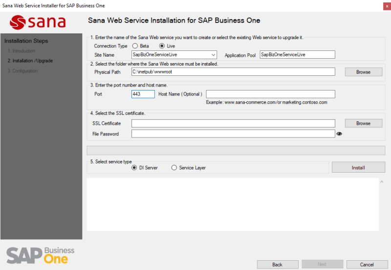 Sana delivers the installer to install and configure the Sana Web service for SAP Business One.