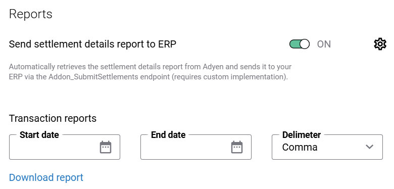 The Settlement Details Report is sent to a custom ERP endpoint that your ERP development team or partner must implement. The expected endpoint name is Addon_SubmitSettlements