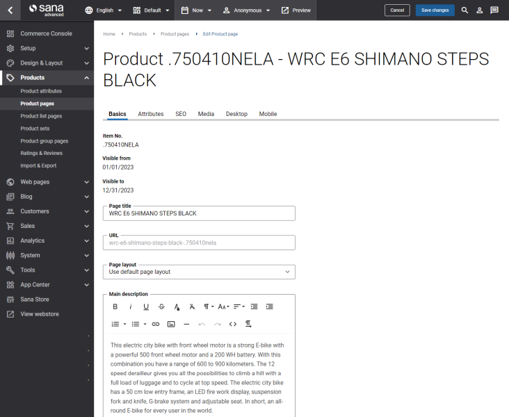 In Sana Admin you cannot create or remove product pages. They are created automatically when you synchronize product information between Sana and your ERP system. The core product data is managed in the ERP system, like title, item number, price, visibility of a product in the webstore. Product pages in Sana Admin are used to add product descriptions in different languages.