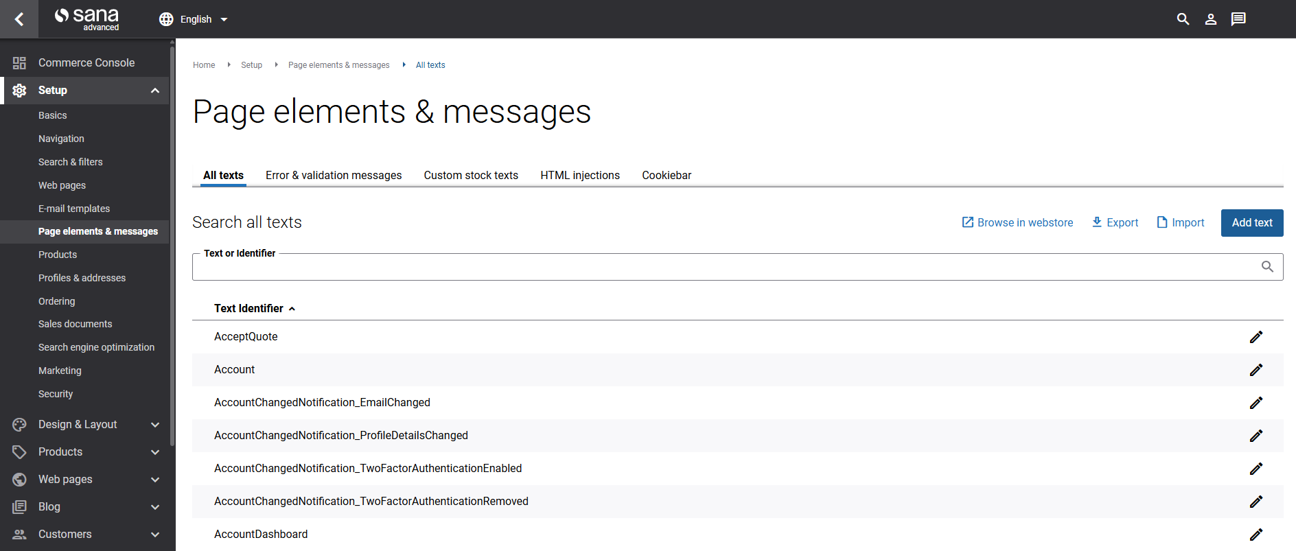 You can search for the necessary text by entering the text or the text identifier. The default webstore interface texts are taken from Page elements & messages in Sana Admin. |