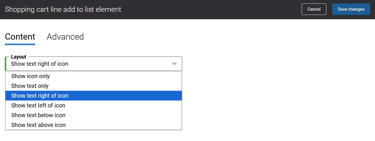 On the Content tab of the Shopping cart line reconfigure button content element, you can control the visibility of the button label using the Show label option.