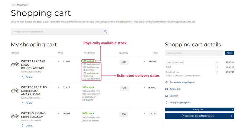 When customers add products to the shopping cart and proceed to checkout, Sana Commerce Cloud can show how many units are physically available in stock. If customers need more than is currently available, Sana can display when the missing quantity will be replenished. For the best user experience, we recommend showing estimated delivery dates alongside physical product availability.