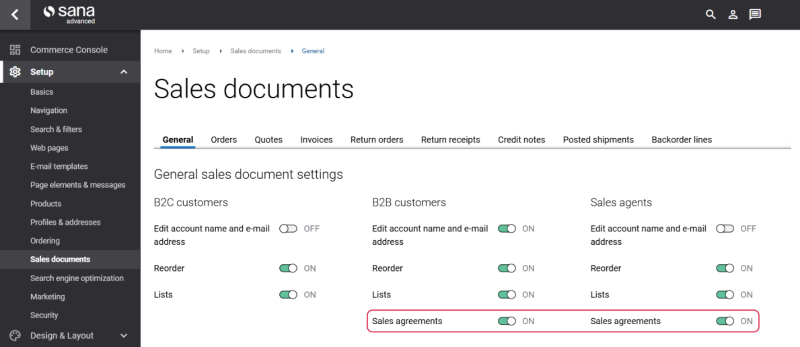 To enable or disable sales agreements for B2B customers and sales agents, log in to Sana Admin and click: Setup > Sales documents > General.