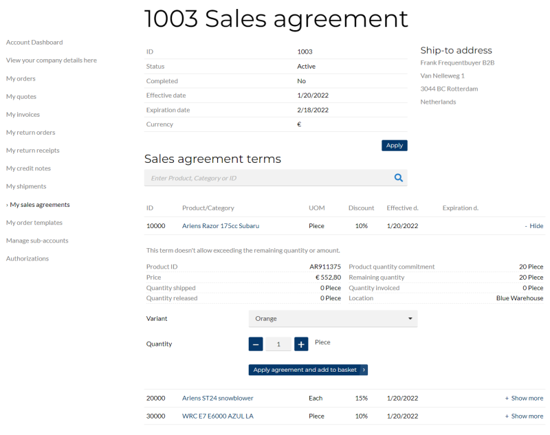 Sales agreements can include predefined shipping addresses. When a sales agreement is applied to a sales order and its shipping address matches the customer’s shipping address, that address will be preselected on the Shipping information step at checkout, but the customer can change it.