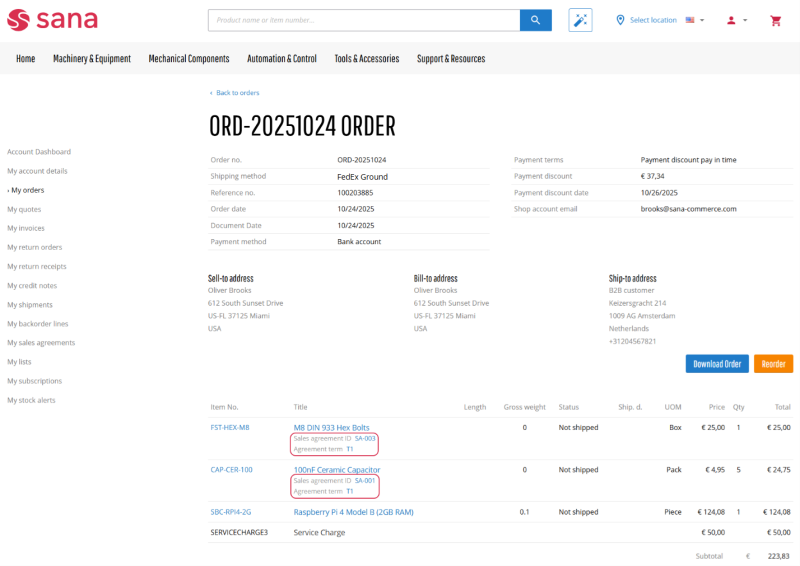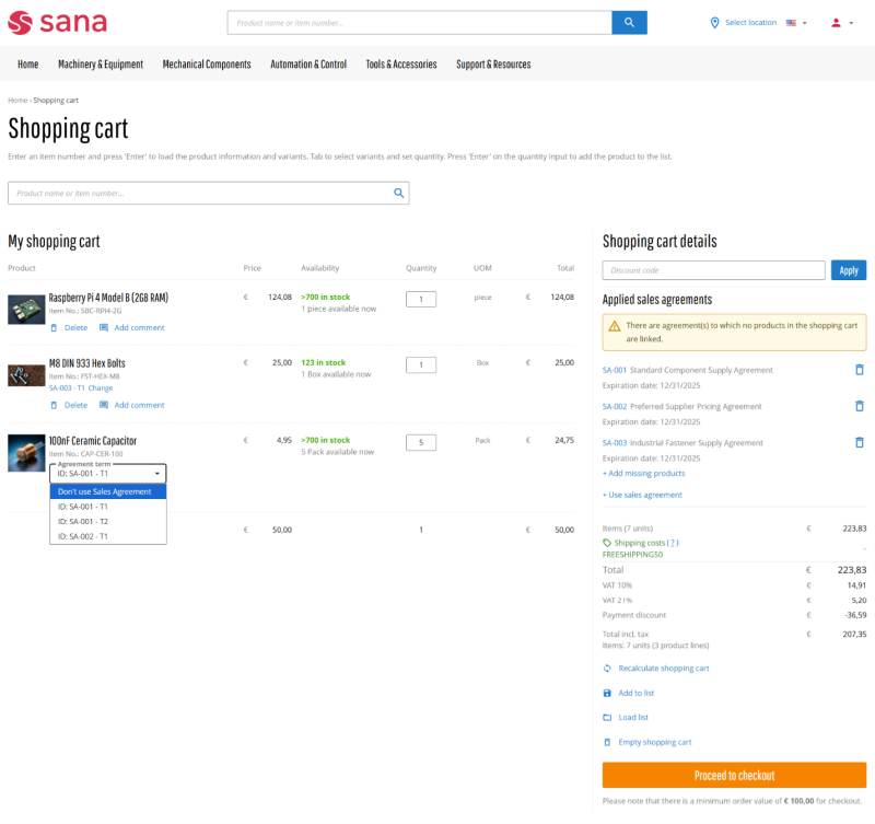 Business customers can see all available sales agreements and their details in the Sana webstore. Customers can place orders based on the sales agreements that they have with the merchants triggering all the terms and conditions in the ERP system. A customer can also combine the products from the sales agreements with those that do not relate to any agreement in one sales order.