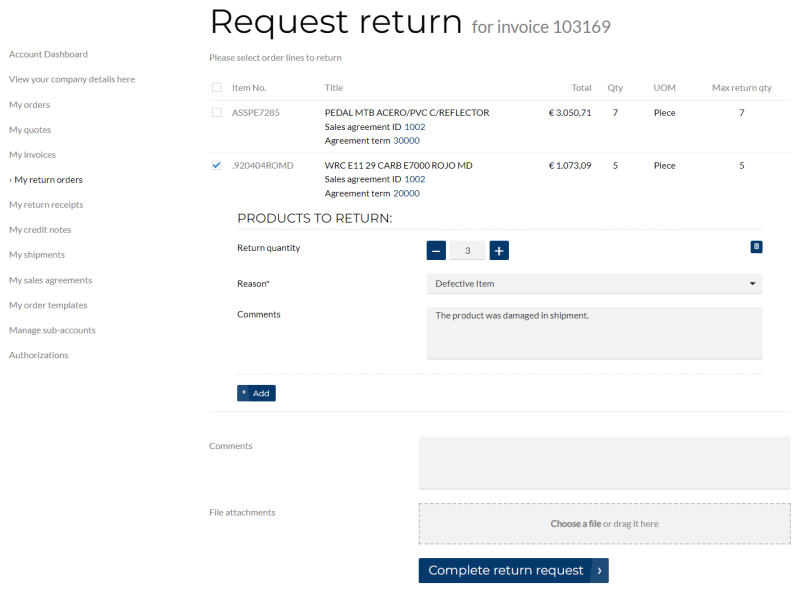 A customer can return products purchased based on sales agreements. When customers create a return order from the invoice, they will see the agreements applied to the sales order lines.