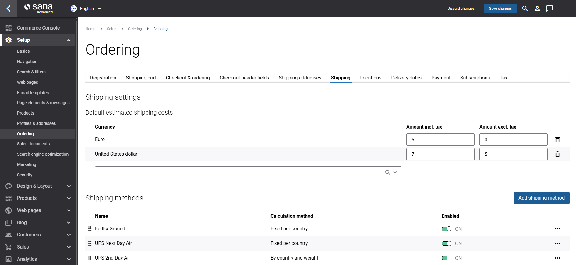 To set up shipping methods, in Sana Admin click: Setup > Ordering > Shipping.