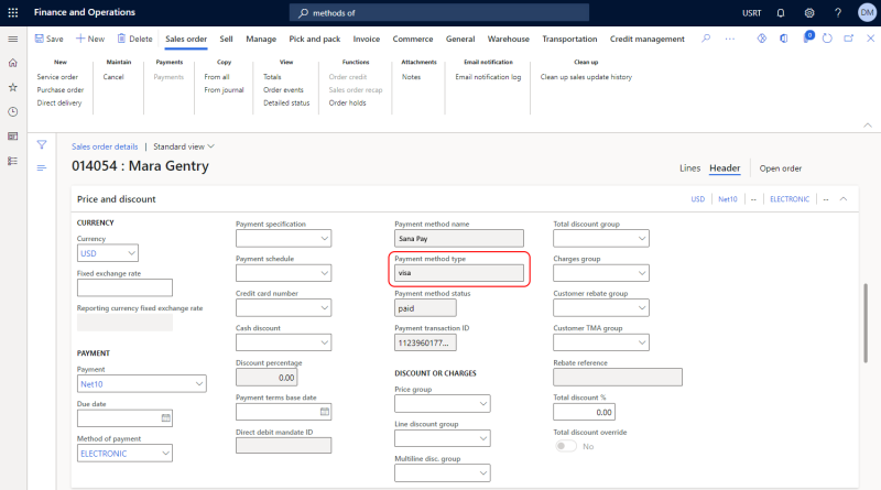 Sana stores various payment information in the order details in Microsoft Dynamics 365 for Finance and Operations, for example, the selected payment method, payment transaction ID, and payment status. In addition to this, Sana now also stores the payment method type that was used by the customer to pay for the order, such as Visa, Mastercard, American Express, etc. This payment method type is sent by the payment service provider used to process payments.