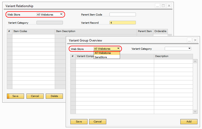 - Previously, creating item variants for customers with multiple webstores was a very time-consuming process because variant groups and relationships had to be configured for each webstore separately. Now you have a choice. You can create variant groups and relationships for all webstores if they are the same, as well as different variant groups and relationships for different webstores.