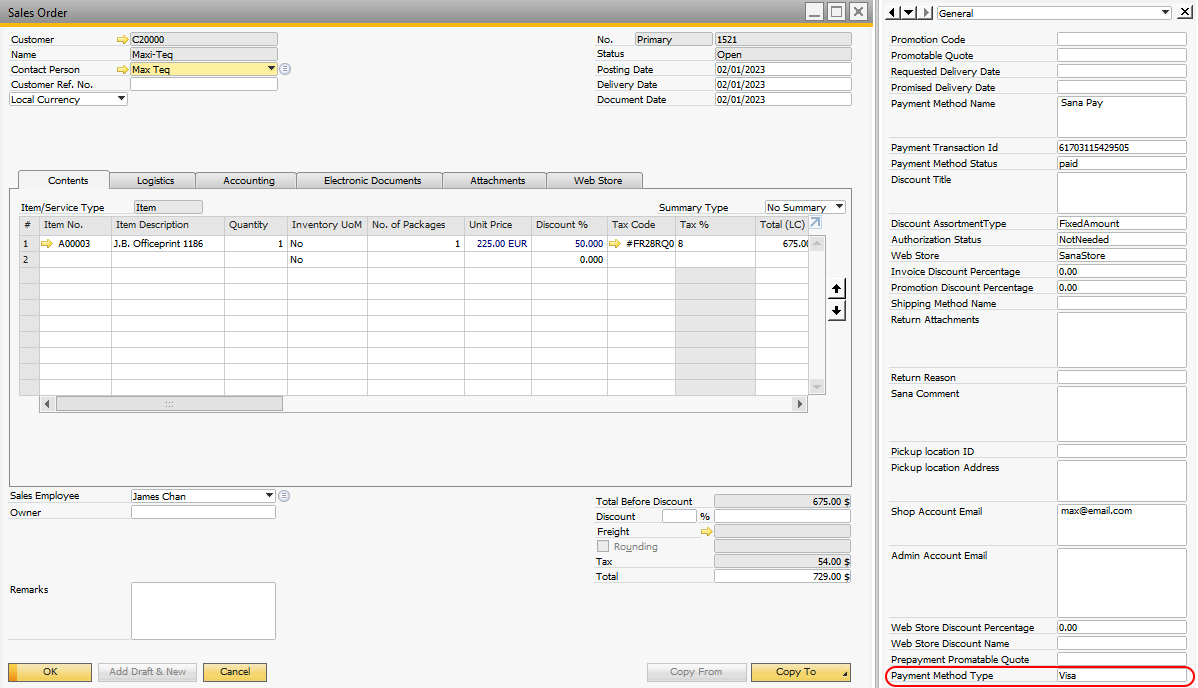 Sana Commerce Cloud stores various payment information in the sales order details in SAP Business One, for example, the selected payment method, payment transaction ID, and payment status. In addition to this, Sana now also stores the payment method type that was used by the customer to pay for the order, such as Visa, Mastercard, American Express, etc. This payment method type is sent by the payment service provider used to process payments.