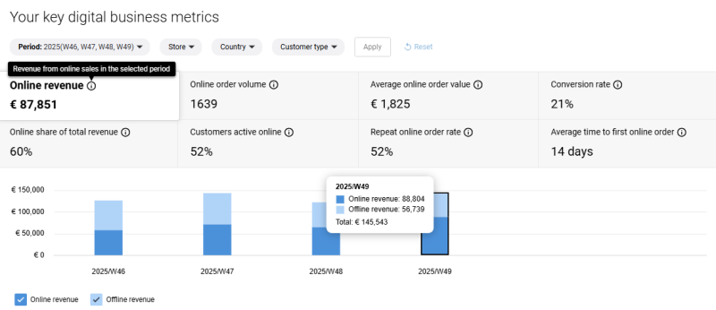 Online share of total revenue: Shows your online revenue as a percentage of total revenue (including offline channels), helping you understand your digital channel's contribution to overall business.