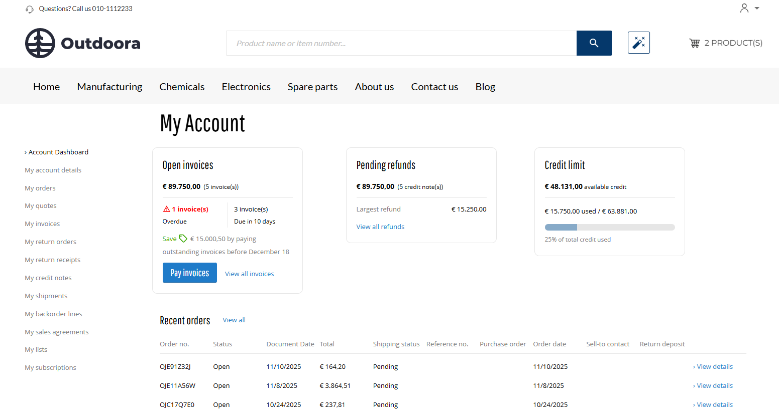 By bringing essential financial information together in one place, the widgets reduce uncertainty and eliminate the need for calls or follow-up e-mails. Buyers can check their available credit, review unpaid invoices, and track the status of their pending refunds at any time. Sellers can personalize the page layout by adding, removing, or rearranging widgets to focus buyers' attention on what matters most to them. They can also decide which widgets are available for each customer segment, ensuring that every customer sees only the information that is relevant to them.