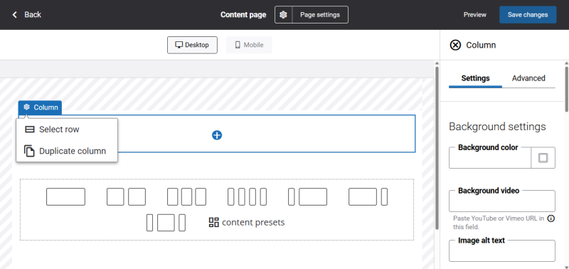 When a column is selected in the page editor, its name and a configure button appear in the top-left corner. Clicking this button opens a dropdown with available actions. From there, you can select the parent row or duplicate the column.